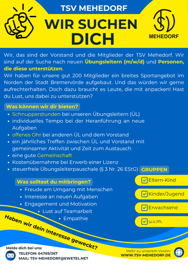 Dich interessiert eine der aufgeführten Sportarten besonders? Dann wirf einen Blick auf die dazu passende Unterseite, um noch mehr Informationen zu erhalten, oder ruf den Ansprechpartner unter der angegebenen Nummer an, um gleich einen Kontakt aufzubauen.