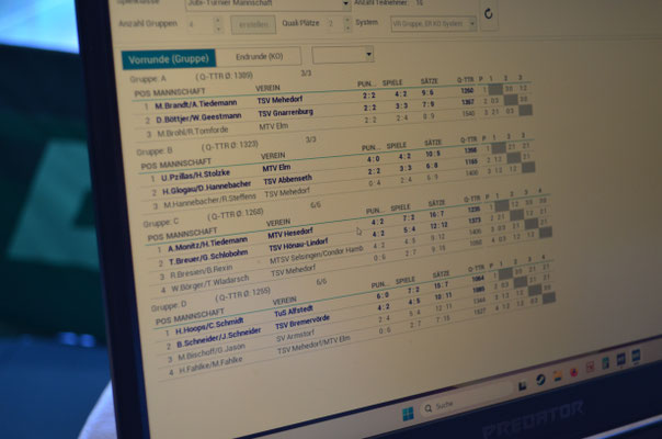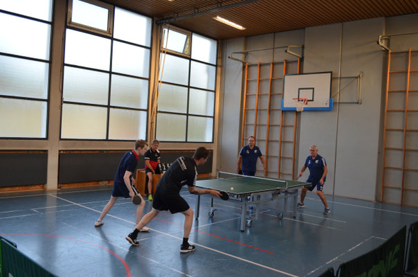 Ab 14 Uhr wurde zunächst in die Gruppenphase gestartet. Dort mussten sich die Zweier-Mannschaften in Gruppen mit drei bzw. vier Teams durchsetzen. In die K.-O.-Phase kamen am Ende nur die besten zwei der Gruppe weiter. Schon hier zeigte sich eine große Überraschung: es setzen sich fast durchgehend die Mannschaften mit den niedrigeren Q-TTR-Werten in der jeweiligen Gruppe durch. Der sogenannte Q-TTR-Wert ist der offizielle Tischtennis-Rating-Wert eines Spielers und soll Auskunft über die Spielstärke geben. Etwas Einfluss auf die Ergebnisse hatte mit Sicherheit auch die geltende Vorgabe des Tages: bei jeweils 50 Q-TTR-Punkten Unterschied zwischen den Teams im Doppel bzw. Gegnern im Einzel gab es 1 Punkt Vorsprung – so konnte ein Match unter Umständen auch mit einem Stand von 5:0 Punkten starten.